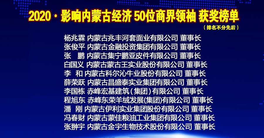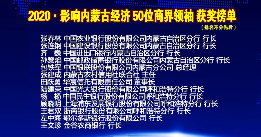 年會上內蒙古金融網、內蒙古新金融研究院隆重推出2020•影響內蒙古經濟50位商界領袖榜單,從2015年度開始,每年按照項目發(fā)展,甄選出當年度引領商界風潮的50位內蒙古最具影響力的商界領袖。