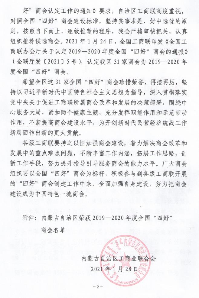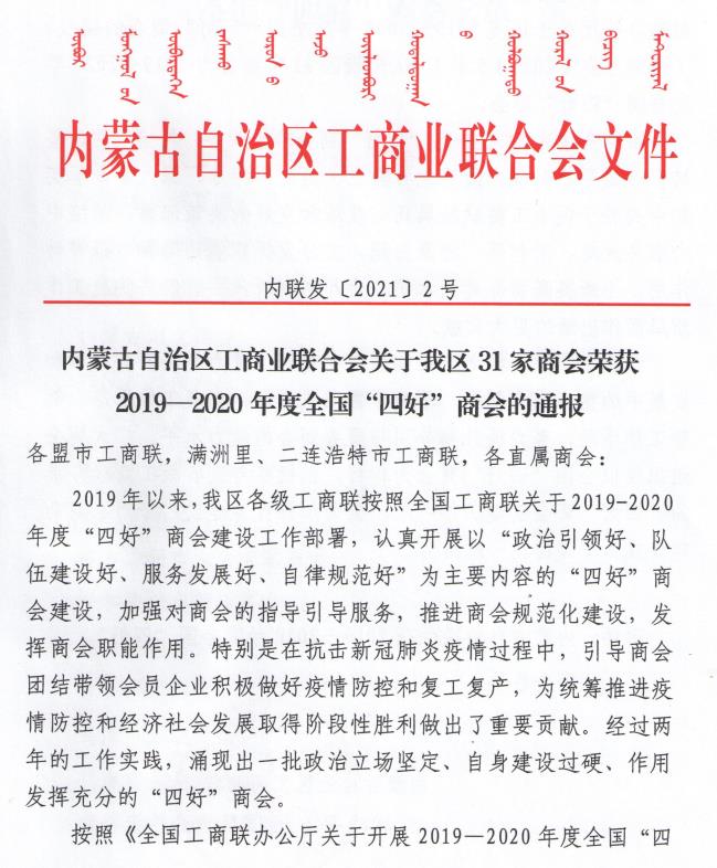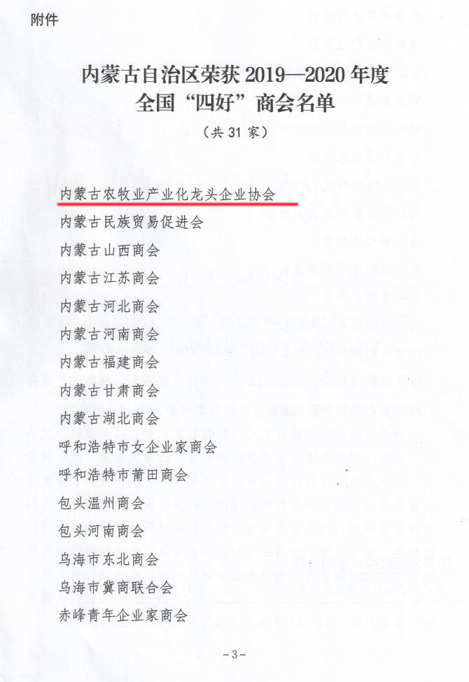 標(biāo)題:喜報!內(nèi)蒙古農(nóng)牧業(yè)產(chǎn)業(yè)化龍頭企業(yè)協(xié)會榮獲全國“四好”商會榮譽稱號