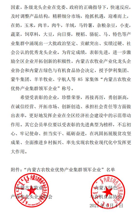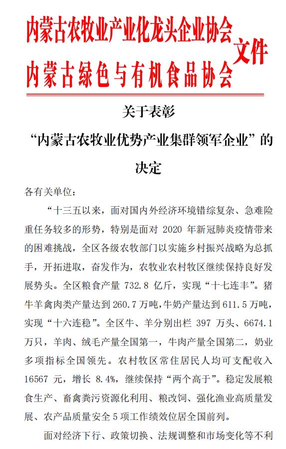 標(biāo)題:關(guān)于表彰“內(nèi)蒙古農(nóng)牧業(yè)優(yōu)勢(shì)產(chǎn)業(yè)集群領(lǐng)軍企業(yè)”的決定