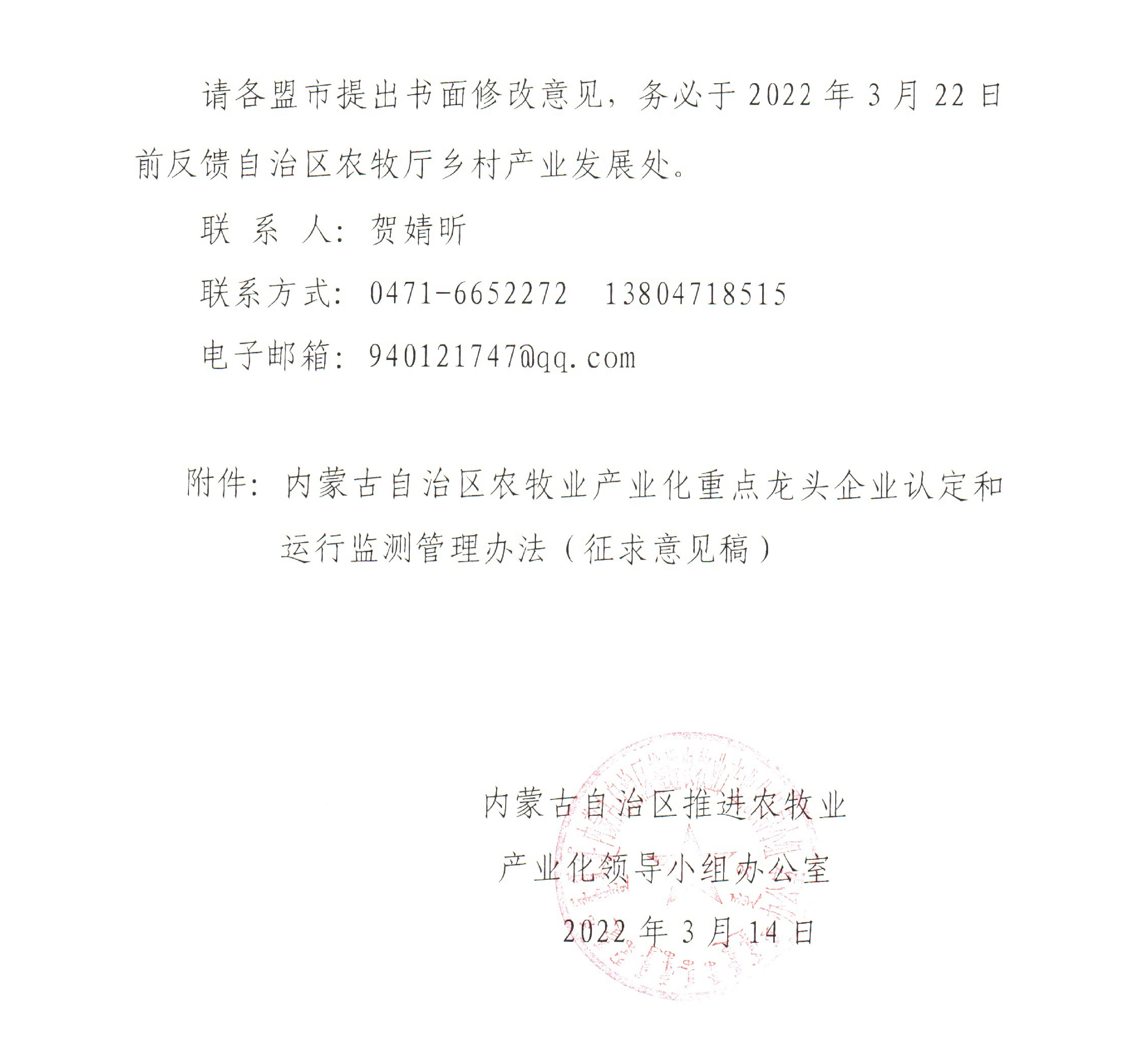 附件:關于征求修訂《內蒙古自治區(qū)農牧業(yè)產業(yè)化重點龍頭企業(yè)認定和運行監(jiān)測管理辦法(征求意見稿)》修改意見的函