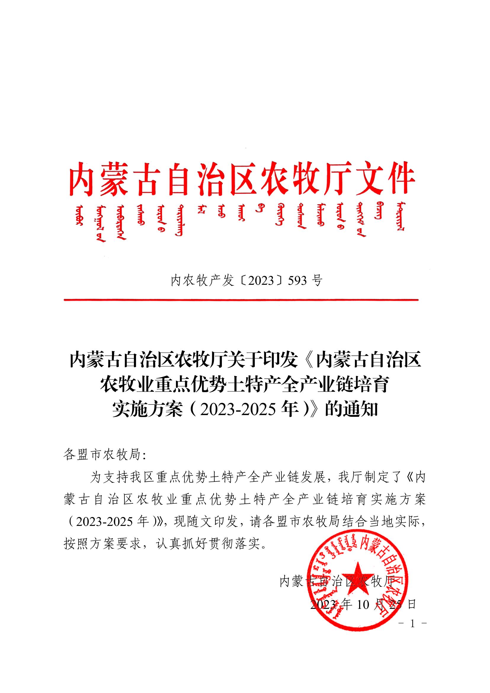標題:內(nèi)蒙古自治區(qū)農(nóng)牧廳關于印發(fā)《內(nèi)蒙古自治區(qū) 農(nóng)牧業(yè)重點優(yōu)勢土特產(chǎn)全產(chǎn)業(yè)鏈培育 實施方案(2023-2025年)》的通知