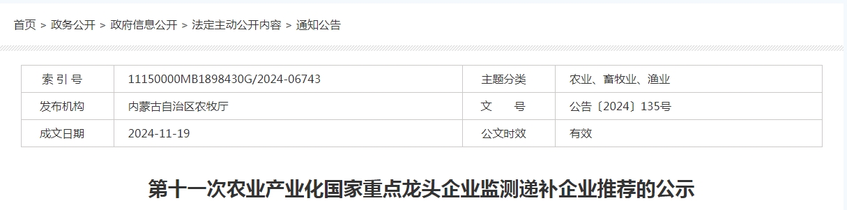 根據(jù)《農(nóng)業(yè)農(nóng)村部辦公廳關(guān)于開展農(nóng)業(yè)產(chǎn)業(yè)化國家重點龍頭企業(yè)企業(yè)監(jiān)測工作的通知》(農(nóng)辦產(chǎn)〔2024〕6號)和《農(nóng)業(yè)產(chǎn)業(yè)化國家重點龍頭企業(yè)認(rèn)定和運行監(jiān)測管理辦法》(農(nóng)經(jīng)發(fā)〔2018〕1號)規(guī)定,立足我區(qū)農(nóng)牧業(yè)產(chǎn)業(yè)發(fā)展實際,我區(qū)開展了第十一次農(nóng)業(yè)產(chǎn)業(yè)化國家重點龍頭企業(yè)監(jiān)測審核和遞補推薦工作。經(jīng)第三方機構(gòu)審核、專家評審、相關(guān)九部門單位會議審查,擬推薦呼倫貝爾農(nóng)墾集團有限公司、巴彥淖爾市圣牧高科生態(tài)草業(yè)有限公司、內(nèi)蒙古騎士乳業(yè)集團股份有限公司、莫力達(dá)瓦達(dá)斡爾族自治旗沃豐生物質(zhì)新材料有限公司、內(nèi)蒙古阜豐生物科技有限公司5家企業(yè)遞補農(nóng)業(yè)產(chǎn)業(yè)化國家重點龍頭企業(yè)。