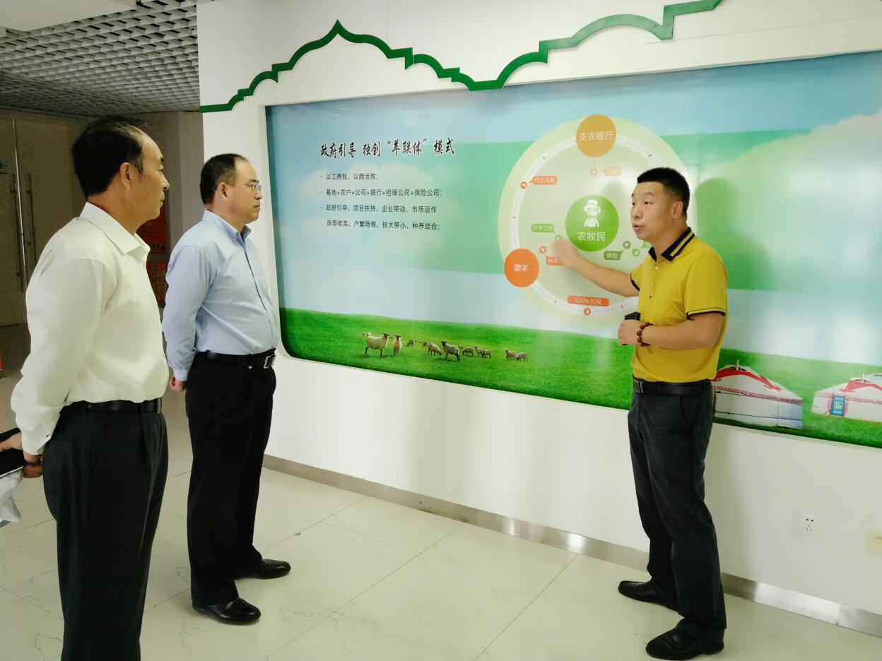2018年9月4日,國務(wù)院參事室金融研究中心研究員王敏,中國人民銀行參事室處長武志,中國人民銀行參事室助手楊福鼎,中國人民銀行呼和浩特中心支行黨委書記、行長肖龍滄,中國人民銀行呼和浩特中心支行金融研究處處長趙建國,在內(nèi)蒙古農(nóng)牧業(yè)產(chǎn)業(yè)化龍頭企業(yè)協(xié)會市場部部長李陽的陪同下,調(diào)研組一行到協(xié)會會長—單位蒙羊牧業(yè)股份有限公司、副會長單位—內(nèi)蒙古宇航人高技術(shù)產(chǎn)業(yè)有限責任公司及會員單位—內(nèi)蒙古和信園蒙草抗旱綠化股份有限公司進行推進綠色金融發(fā)展專題調(diào)研。