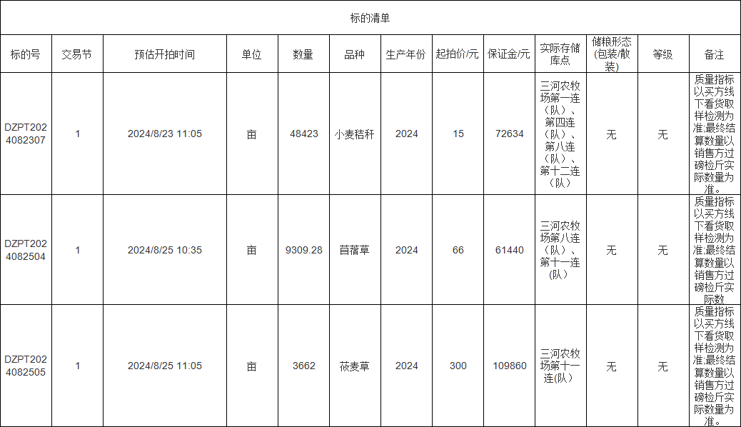 轉(zhuǎn)讓標(biāo)的為苜蓿草、莜麥草、小麥秸稈,涉及面積苜蓿草9309.28畝、莜麥草3662畝、小麥秸稈48423畝,意向受讓方在競標(biāo)前應(yīng)自行對標(biāo)的預(yù)估數(shù)量和質(zhì)量情況進(jìn)行充分了解,交易標(biāo)的均以實際狀況為準(zhǔn)。標(biāo)的存放地位于三河農(nóng)牧場,詳情見標(biāo)的清單:
