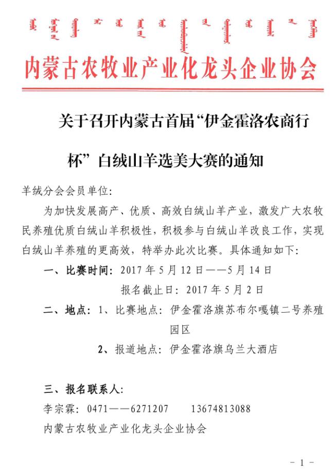 關(guān)于召開內(nèi)蒙古首屆“伊金霍洛農(nóng)商行杯”白絨山羊選美大賽的通知