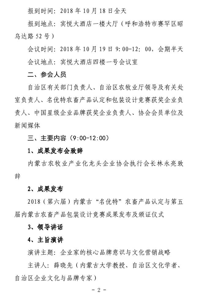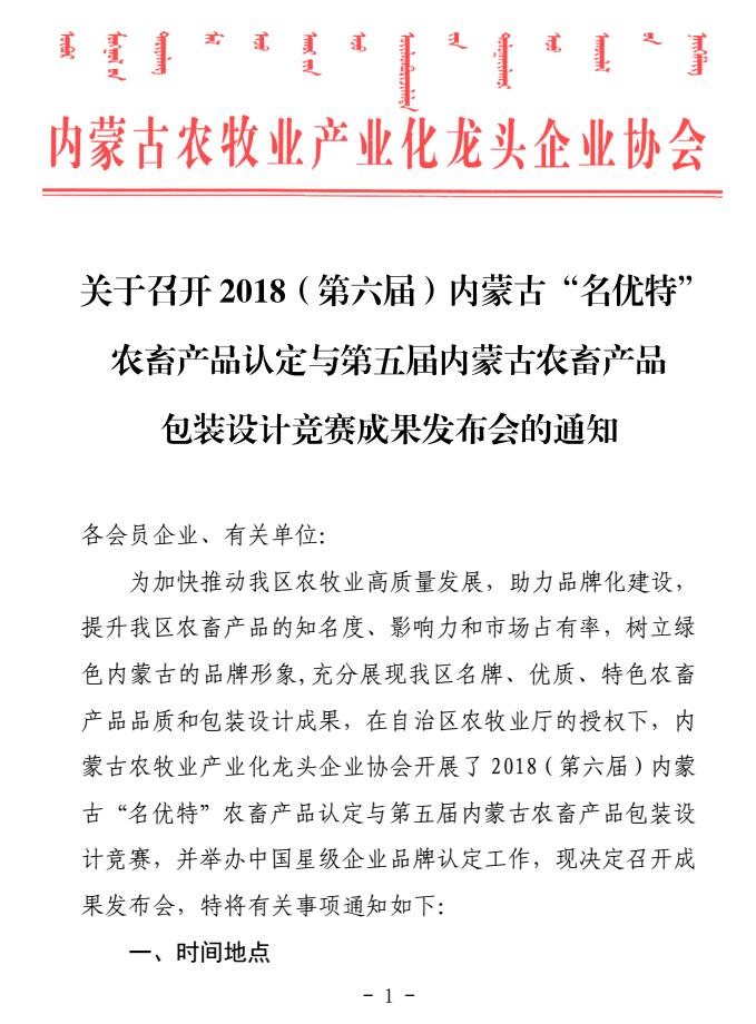 關(guān)于召開2018(第六屆)內(nèi)蒙古“名優(yōu)特”農(nóng)畜產(chǎn)品認(rèn)定與第五屆內(nèi)蒙古農(nóng)畜產(chǎn)品包裝設(shè)計(jì)競(jìng)賽成果發(fā)布會(huì)的通知