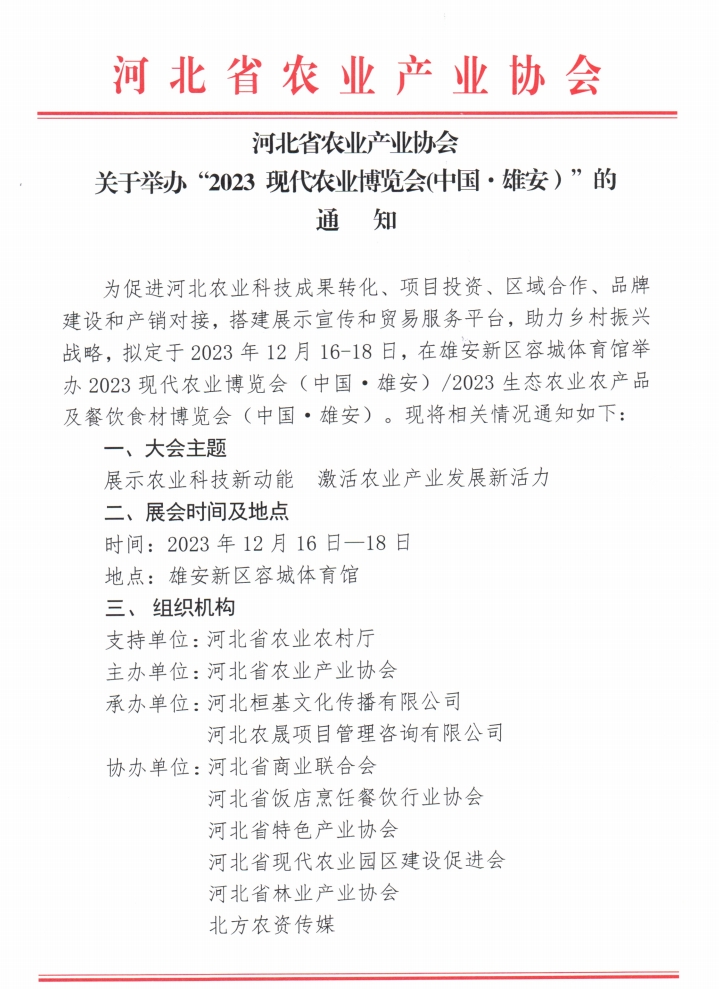 轉發(fā):河北省農業(yè)產業(yè)協(xié)會關于舉辦“2023 現代農業(yè)博覽會(中國·雄安)”的通知