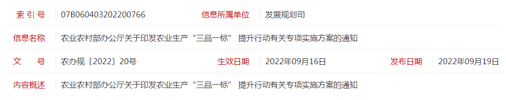 標(biāo)題:農(nóng)業(yè)農(nóng)村部辦公廳關(guān)于印發(fā)農(nóng)業(yè)生產(chǎn)“三品一標(biāo)” 提升行動有關(guān)專項實施方案的通知