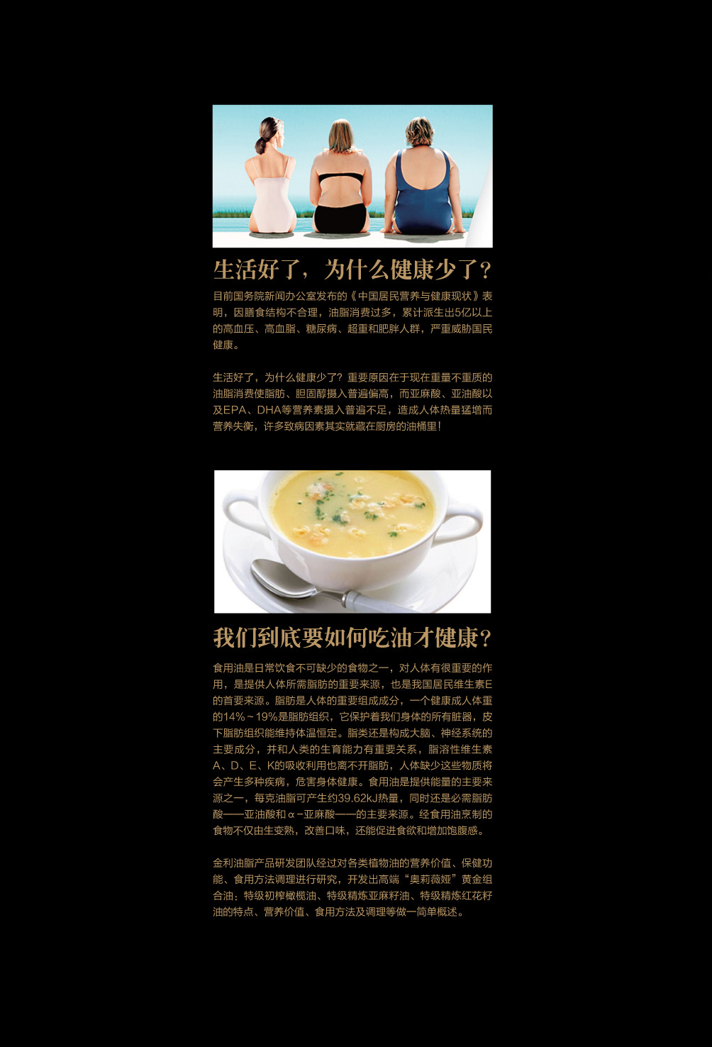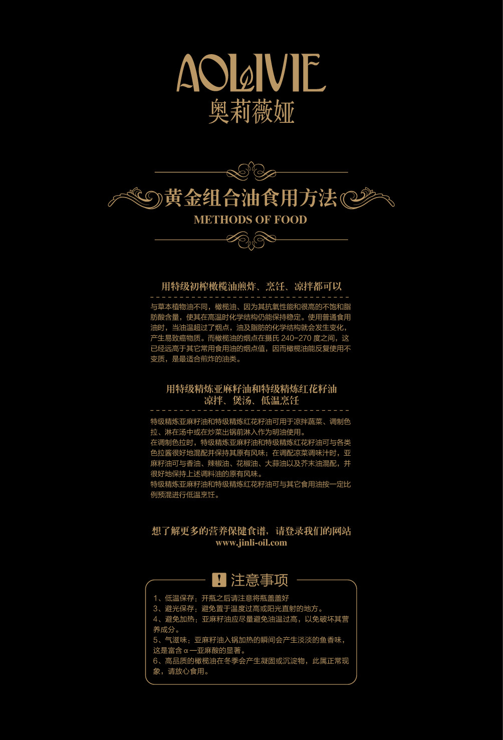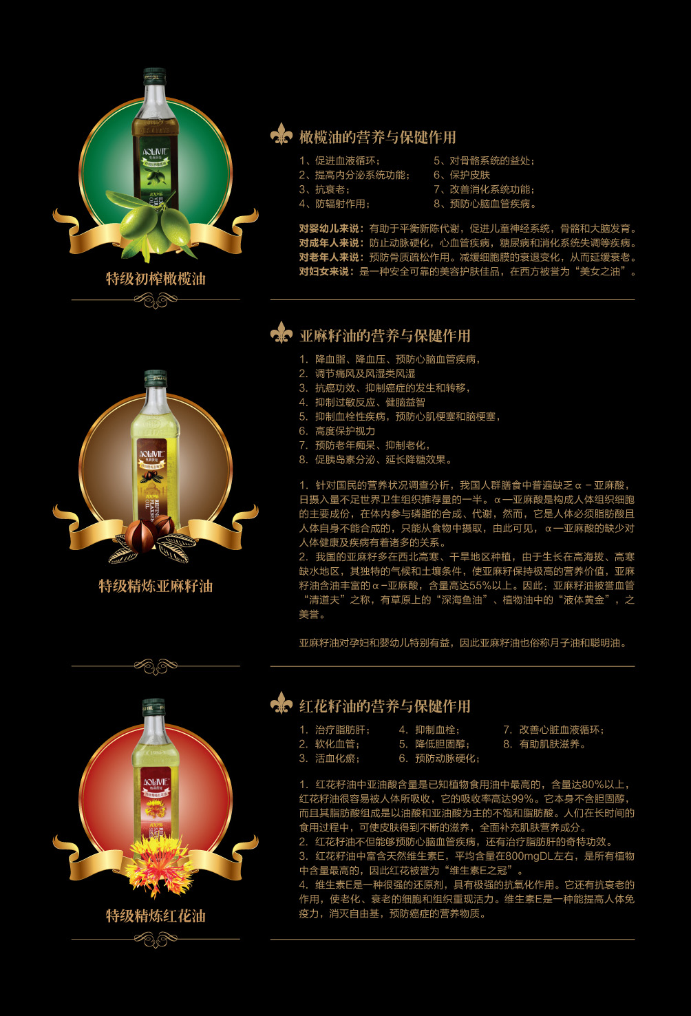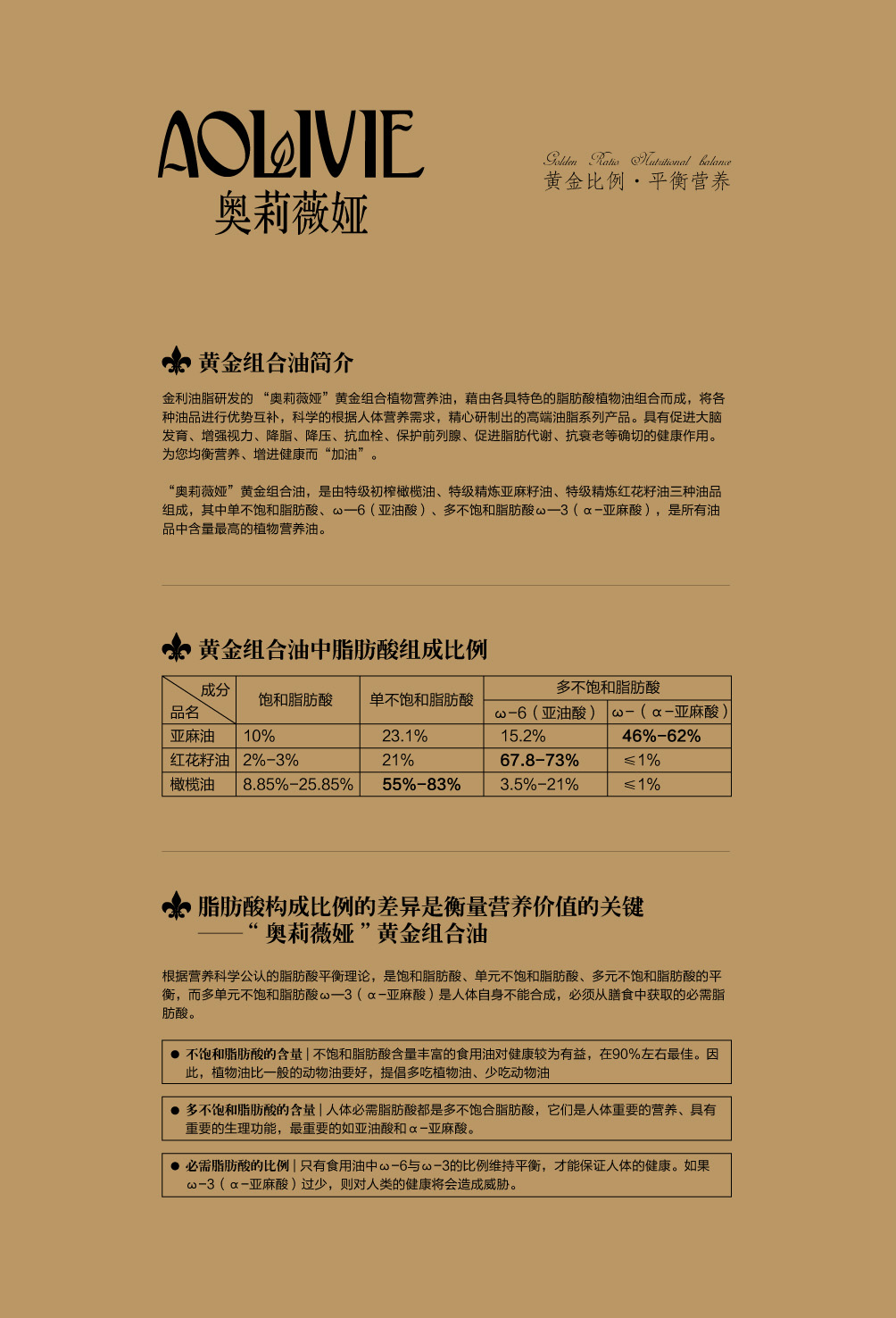 金利油脂(蘇州)有限公司研發(fā)的:“奧莉薇婭黃金組合植物營養(yǎng)油,有各具特色的脂肪酸植物油組合而成,將各種油品進行優(yōu)勢互補,科學的根據(jù)人體營養(yǎng)需求,精心研制出的高端油脂系列產(chǎn)品。具有促進大腦發(fā)育/增強視力/降脂/降血壓/抗血栓/保護前列腺/促進脂肪代謝/抗衰老等良好的保健作用。為您均衡營養(yǎng)/增強體質而“加油”?!皧W莉薇婭黃金組合油,是有特級初榨橄欖油/特級冷榨亞麻籽油/特級精煉紅花籽油三種油品組成,其中單不飽和脂肪酸/α—亞麻酸和亞油酸,是所有植物油中含量最高植物營養(yǎng)油。