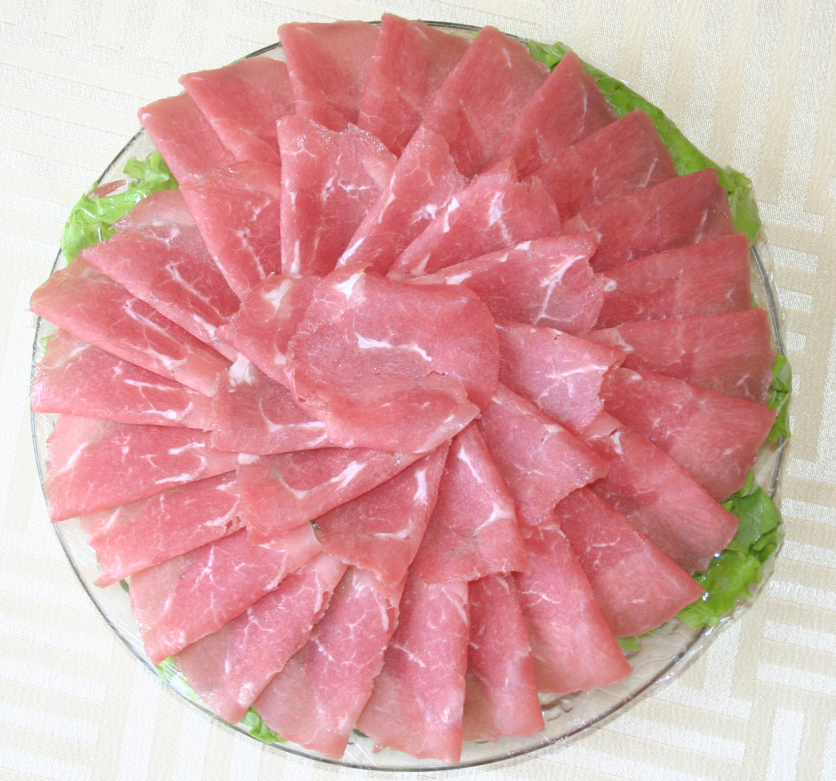 十六、太陽卷:選用原料:精選后的上腦下五指寬的排圍邊,卷制而成。特點(diǎn):白圍邊,紅內(nèi)襯。切片之后紅白相稱,形似太陽,肉質(zhì)鮮嫩。羊肉產(chǎn)品中的極品。