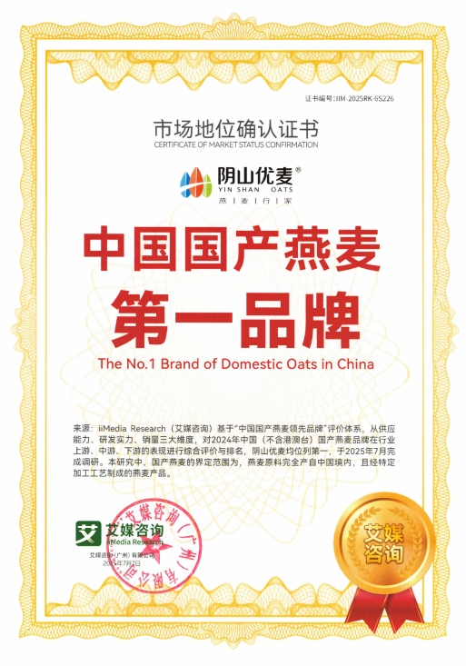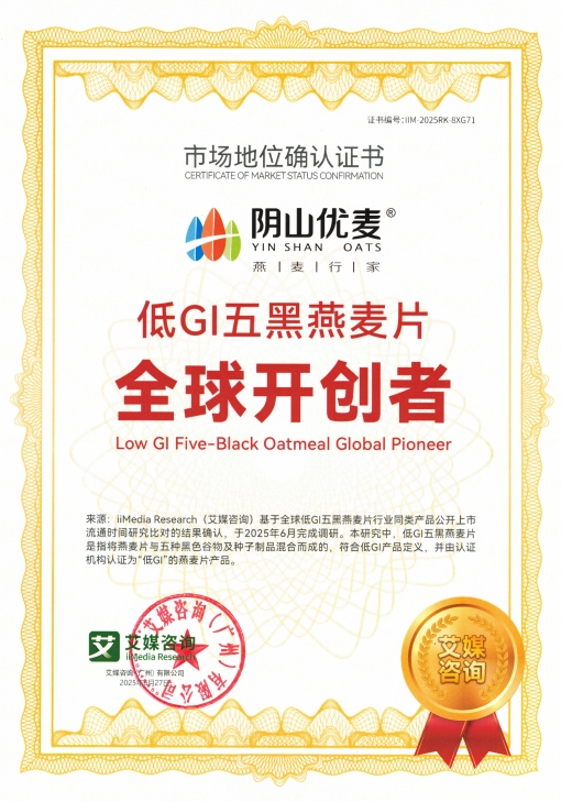 2025年7月,內(nèi)蒙古陰山優(yōu)麥?zhǔn)称酚邢薰精@得權(quán)威咨詢機構(gòu)艾媒咨詢(iiMedia Research)頒發(fā)的“全球裸燕麥第一品牌”與“中國國產(chǎn)燕麥第一品牌”市場地位確認證書。同時,其創(chuàng)新產(chǎn)品“低GI五黑燕麥片”亦被權(quán)威認證為全球開創(chuàng)者,標(biāo)志著陰山優(yōu)麥在全球燕麥行業(yè)取得突破性成果。